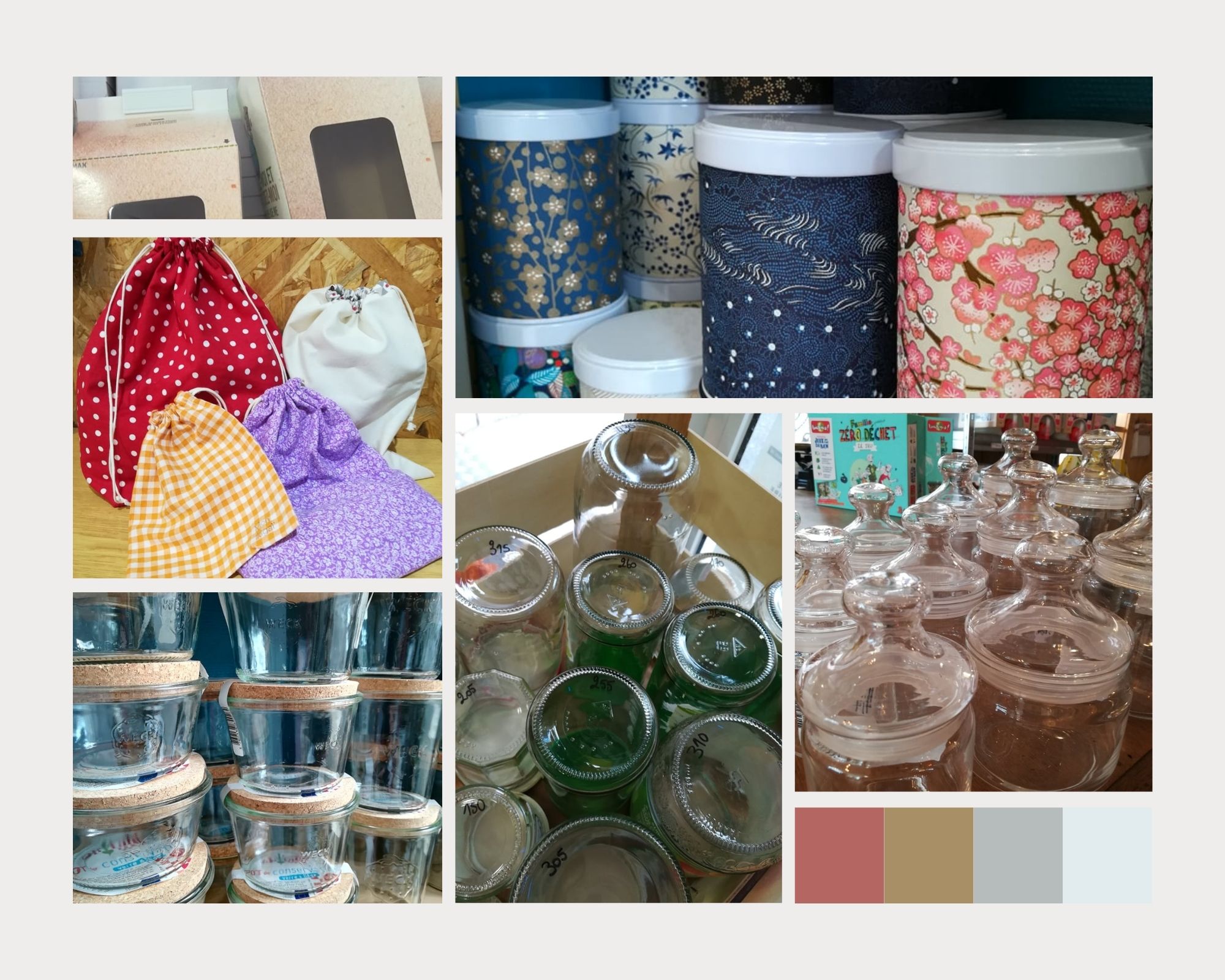 Tout ça pour dire qu’on vous propose, en version gratuite, des bocaux donnés par les clients (vous, merci), lavés et pesés, et réutilisables of course, et en version payante, tout un tas de jolis contenants et bouteilles de toutes tailles en tissus, verre, inox… pour que les courses soient pratiques et la cuisine jolie. Elle est pas belle, la vie ?